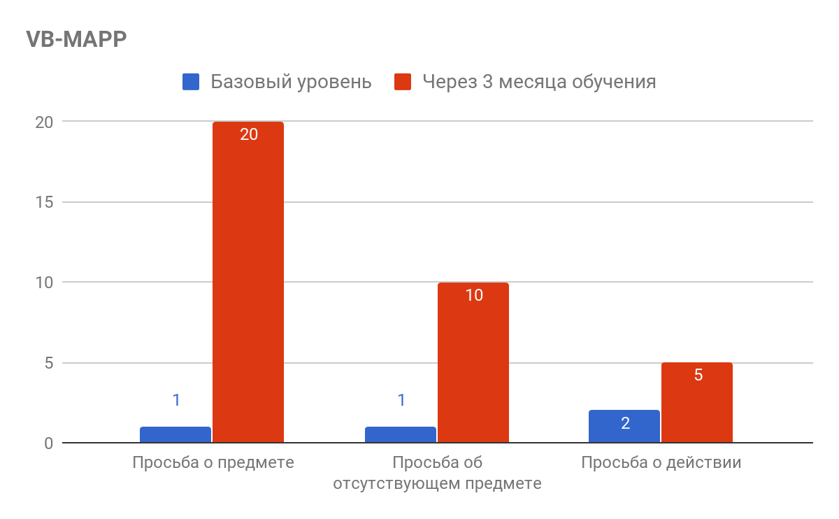 Через 3 месяца АВА-терапии ребенок использует более 30 слов для выражения просьбы: