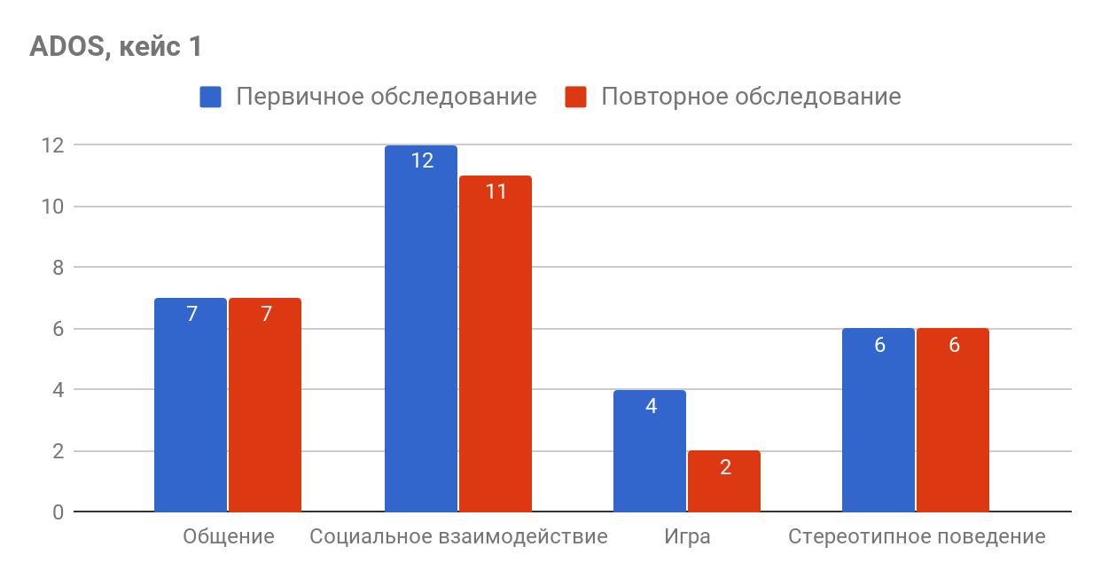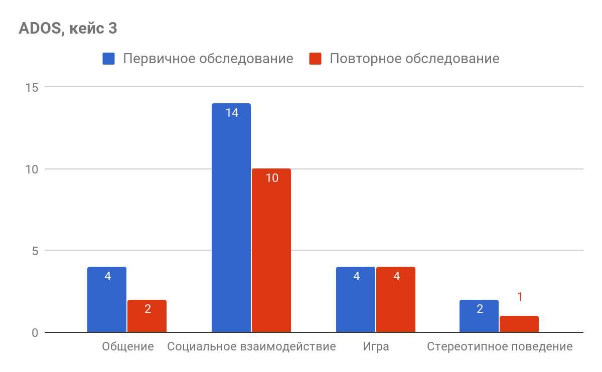 Клиническое наблюдение за состоянием детей в формате диагностики ADOS было проведено в два этапа: в начале и в середине 2016/2017 учебного года. Ниже представлены результаты сравнительного анализа обоих срезов на примере отдельных кейсов.