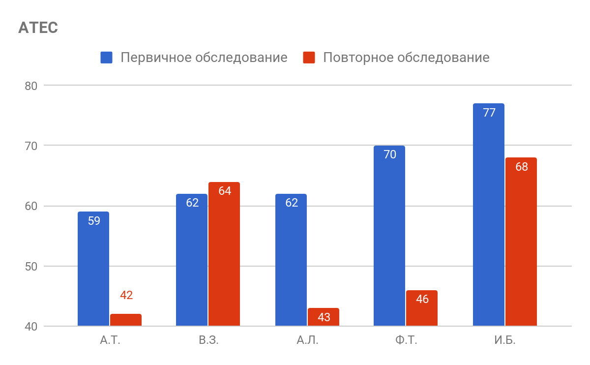 Исходя из полученных данных видно, что согласно ATEC, четверо из пяти детей показали выраженную положительную динамику развития.