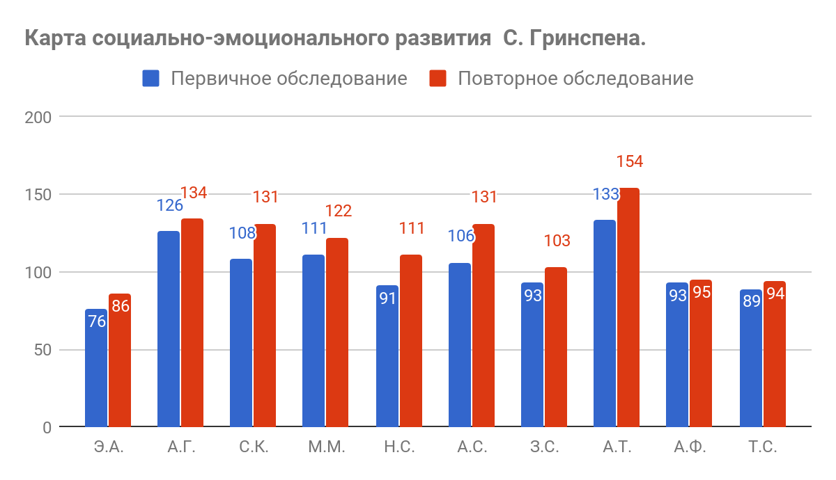 Карта социально-эмоционального развития Стэнли Гринспена содержит в своей структуре блок вопросов, оценивающих переработку ребенком сенсорной информации (визуальных, тактильных, звуковых стимулов) и 6 стадий - ступеней функционально-эмоционального развития, оценивающих различные функциональные способности ребенка. Исходя из полученных данных видно, что по общему показателю наблюдается улучшение состояния всех детей, проходивших реабилитацию и принимавших участие в оценке.