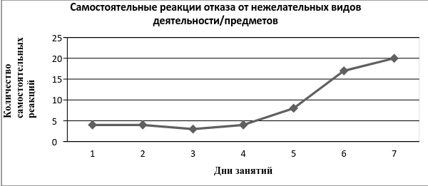 Речь и коммуникация. Навыки вербальной коммуникации сформированы ниже возрастной нормы, при достаточно обширном словарном запасе, не все слова мальчик может произносить четко и бегло. Тестирование выявило неспособность мальчика отказываться от нежелательных действий и просить удалить неприятный предмет. Во время наблюдения, анкетирования и сбора данных на занятии и дома ребенок проявлял нежелательное поведение — плакал, падал на пол, стучал ногами, руками по полу, по стене. Направление работы. Научить ребенка отказываться от нежелательных видов действий либо от неприятных стимулов. Применяемые методы. Случайного обучения с использованием натуральных последствий и метод формирования реакций. При подвижных играх с мальчиком моделировались ситуации, когда взрослый догонял ребенка, обнимал его, создавая небольшой дискомфорт и приостанавливался, выжидал 2 секунды, если ребенок молчал, давал полную вербальную подсказку «Пусти». Редуцировал подсказку «Пус-», мальчик добавлял «-ти», взрослый произносил «пу-», ребенок «-ти». На каждом занятии инициировалось минимум 20 таких ситуаций. Последние 4 реакции были полные и самостоятельные, мальчик говорил «Пути». Также ребенку предъявлялись 2 предмета — мотивационный и немотивационный. Взрослый спрашивал: «Хочешь яблоко?». Мальчик соглашался, отвечал «да» и кивал головой. При предъявлении немотивационного предмета с помощью моделинга жеста и вербальной подсказки «нет» формировали отказ от неприятных стимулов, таких как квашеная капуста, морская капуста, авокадо, редис, перец. На занятиях терапист и в течение дня родители ребенка создавали как минимум 50 ситуаций, в которых ребенок учился отказываться. И на 7 занятии мальчик (прошло 2 недели) демонстрировал самостоятельный вербальный отказ от нежелательных действий и стимулов.